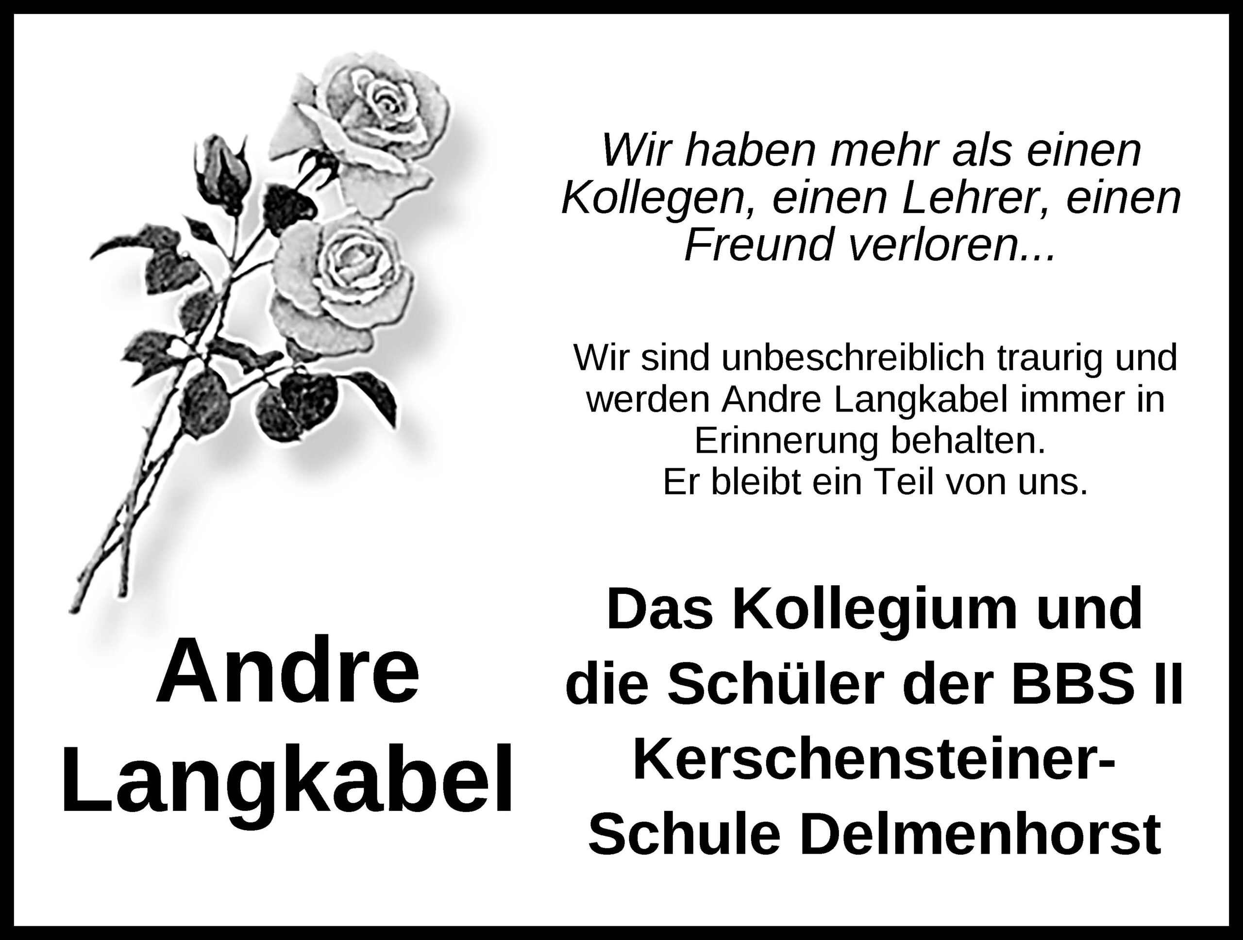 Wir trauern um André Langkabel, der viele Jahre an unserer Schule als Fachpraxislehrkraft im Bereich der Fahrzeugtechnik tätig war und viel zu früh von uns gegangen ist. Mit ihm verlieren wir eine fachlich wie menschlich hoch geschätzte Lehrkraft. Als Fachpraxislehrkraft für Fahrzeugtechnik hat er seinen Beruf sehr geliebt und diesen stets mit großer Verlässlichkeit und hohem Pflichtbewusstsein ausgeübt. Er war ein optimistischer und ausgeglichener Mensch, der seinen Erziehungsauftrag gegenüber den Schülerinnen und Schülern immer freundlich, klar und zielführend wahrgenommen hat.