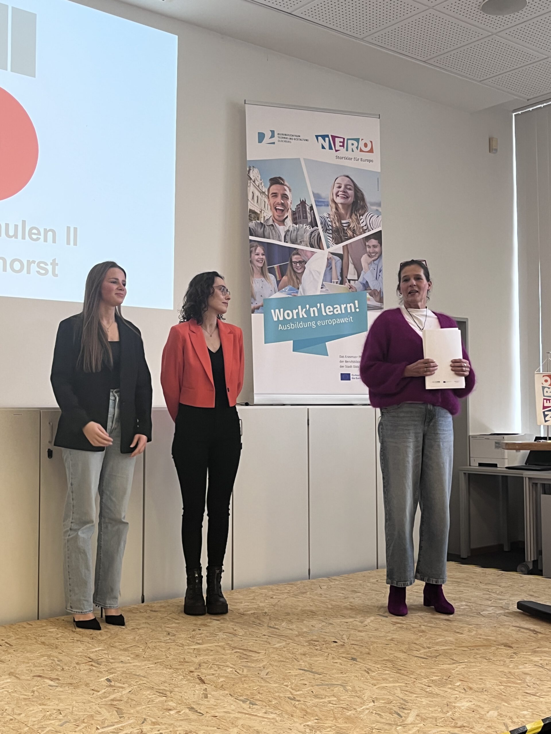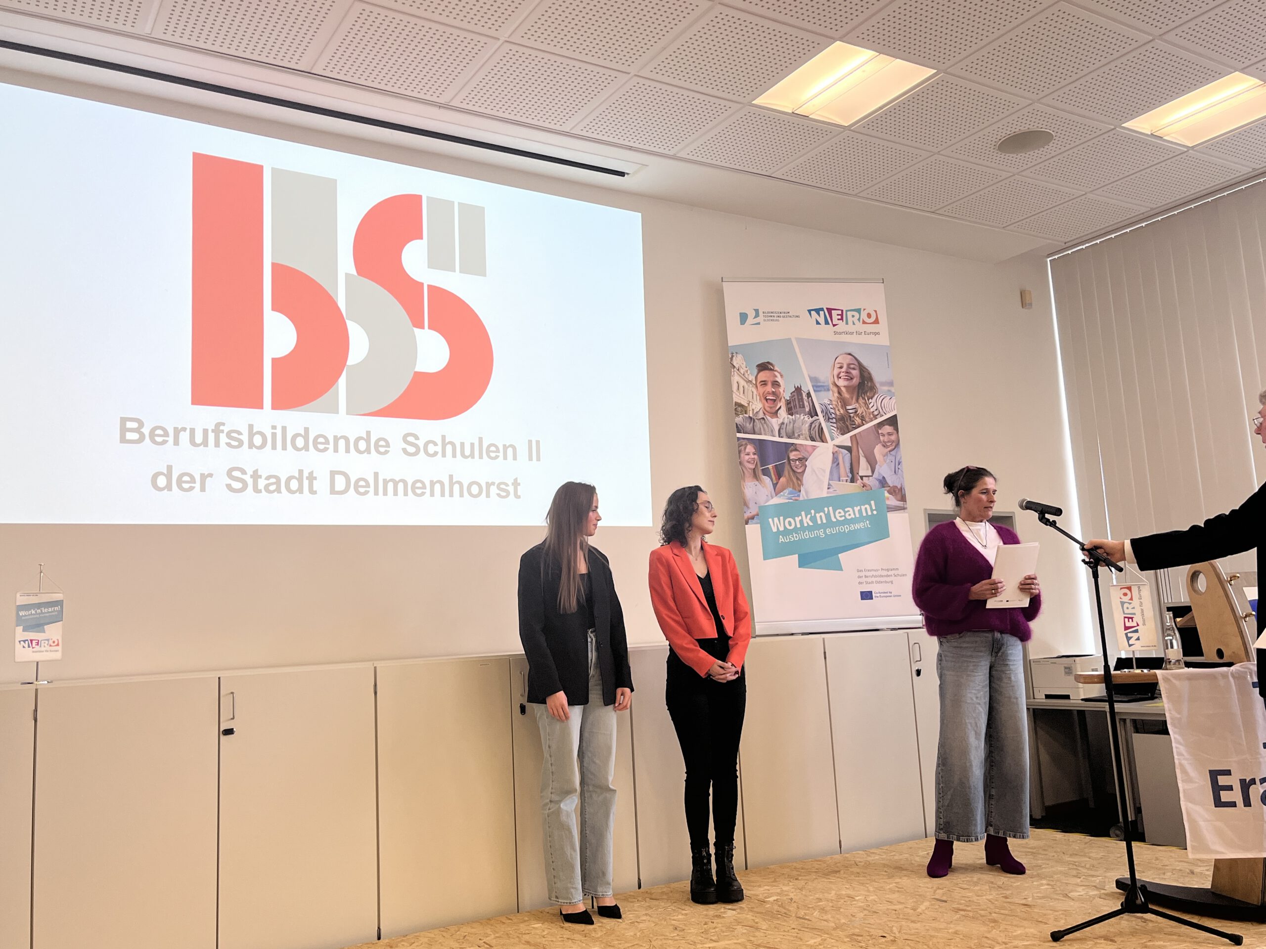 Die Europässe wurden ihnen von ihrer Lehrerin Frau Georgia Villanes Erquinio feierlich überreicht. Marie Tietgens und Tia Sprung sind zugleich die ersten beiden Schülerinnen, die ein von der BBS 2 Delmenhorst organisiertes Auslandspraktikum absolviert haben. Damit leisten sie einen wichtigen Beitrag zur weiteren Internationalisierung der Ausbildung.